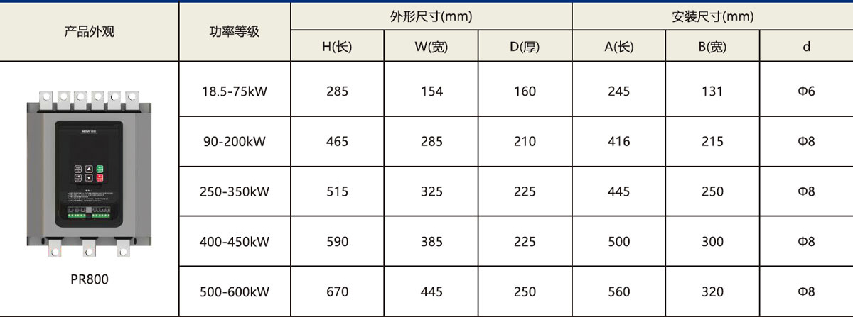 NHNA-PR800旁路式软启动器外形及安装尺寸(mm):