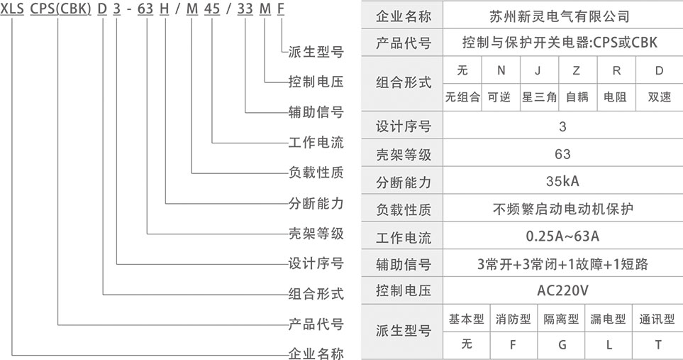 例一: XLSCPS(CBK)3-63H/M32/33MF,表示一台63型 XLSCPS(CBK)3,分断能力35kA,负载性质:不频繁启动电机保护,工作电流32A,辅助信号要求是:3常开+3常闭+1故障+1短路,控制电压是220V,带消防功能(只报警不跳闸)。