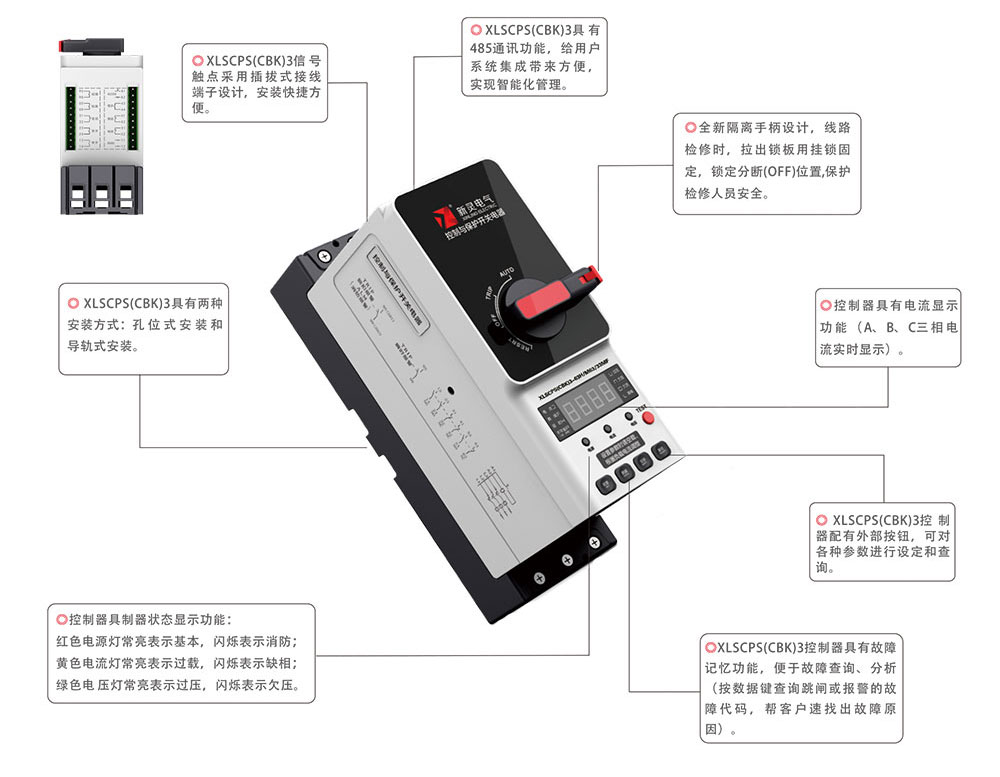 XLSCPS(CBK)3具有远距离自动控制和就地直接人工控制功能,具有过载、短路、欠流、漏电、过压、欠压、断相、堵转、隔离、三相不平衡、485通讯、物联网等功能。